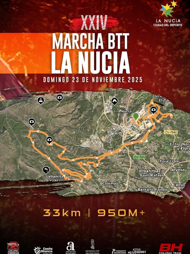 La XXIV Marcha de Bicicletas de Montaña (BTT) de La Nucía se disputa el domingo 23 de noviembre. Está organizada por “La Nucía Coloma Bike Club”, BH Coloma Team y la Federación de Ciclismo de la Comunidad Valenciana con la colaboración de concejalía de Deportes del Ayuntamiento de La Nucía y la Diputación de Alicante.