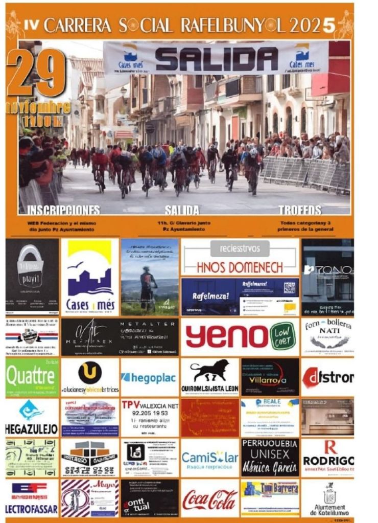 El sábado, 29 de noviembre, tendrá lugar la IV Carrera Social Rafelbunyol. La salida está prevista para las 11 horas desde la Plaza del Ayuntamiento. Las inscripciones se cierran el jueves a las 20 horas. El pelotón tendrá que dar 24 vueltas a un circuito de 2,7 kilómetros hasta completar los 64,800 que ha previsto el club organizador, el HEGOPLAC-G4 CC.