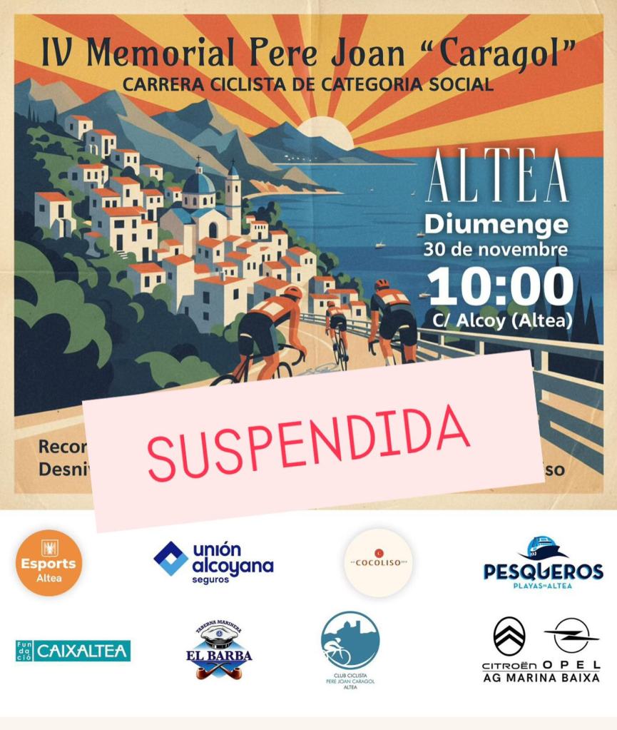 El IV Memorial Pere Joan “Caracol”, que debía disputarse este domingo 30 de noviembre en Altea, ha quedado suspendido. Una prueba, de caracter social, en la que que por primera juveniles y sub 23 podían participar totalmente gratis junto a los Máster, deja de organizarse. Tan solo habían 36 inscritos.
