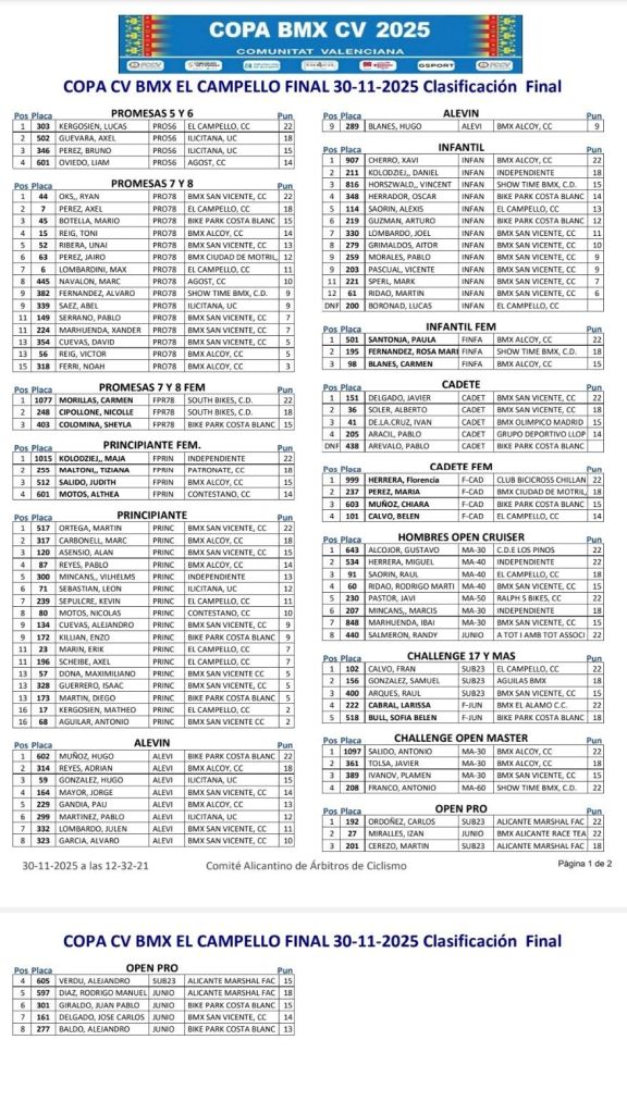 El Campello ha puesto el punto y final a la Copa CV BMX. Lucas Kergosien (El Campello) se ha impuesto en Promesas 5 y 6; Ryan Oks (BMX San Vicente) y Carmen Morillas (South Bike), en Promesas 7 y 8; Maja Kolodziej y Martín Ortega (BMX San Vicente), en Principiantes; Hugo Muñoz ( Bike Park Costa Blanca) y Hugo Blanes (BMX Alcoy), en Alevines; Xavi Cherro (BMX Alcoy) y Paula Santonja (BMX Alcoy), en Infantiles; Javier Delgado (BMX San Vicente) y Florencia Herrera, en Cadetes; Gustavo Alcojor (Los Pinos), en Hombres Open Cruiser; Fran Calvo (El Campello), en Challenge 17 y más; Antonio Salido (BMX Alcoy), en Challenge Open Máster; y Carlos Ordóñez (Alicante Marshall Racing Team), en Open Pro.