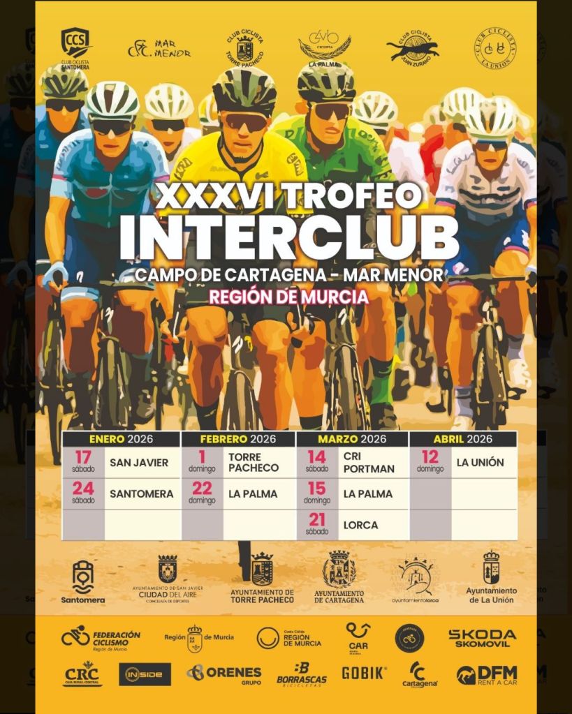 San Javier será la primera parada del XXXVI Trofeo Interclub Campo de Cartagena Mar Menor el 17 de enero. El Torneo tendrá 8 pruebas y estará organizado por la Federación de Ciclismo de la Región de Murcia, con la colaboración del CC Mar Menor, tiene prevista su fecha para el próximo 17 de enero.