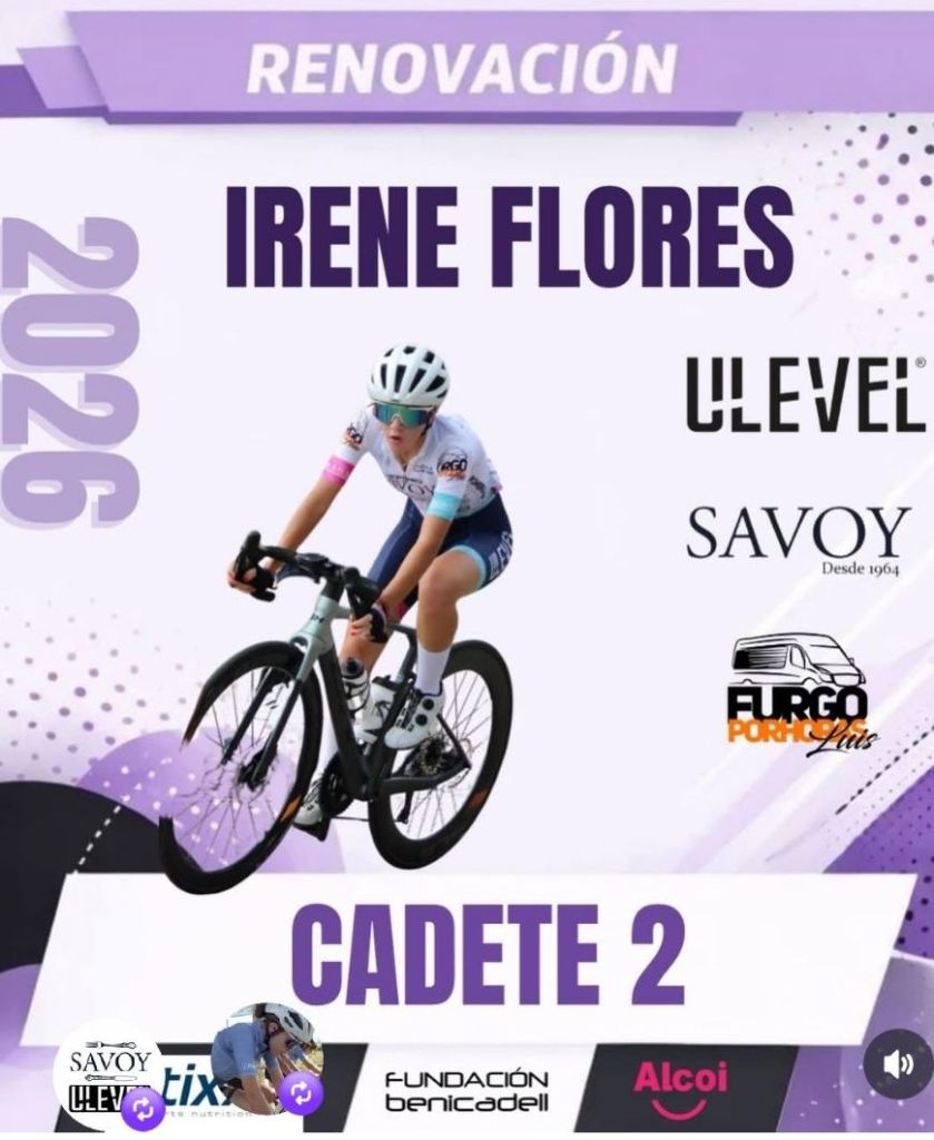 El Hostal Savoy Ulevel WTeam ha hecho oficial la renovación de Irene Flores (Almoines, 14 de mayo 2010) para la temporada 2026. De esta forma, continuará con su formación y aprendizaje como ciclista, tras una campaña brillante como cadete, en el conjunto femenino de la Fundación Benicadell. En 2025 estrenó su palmarés en la categoría en el II Gran Premio de Ciclismo Femenino – Talento en movimiento UMH, prueba puntuable para la Challenge de Féminas de la CV.