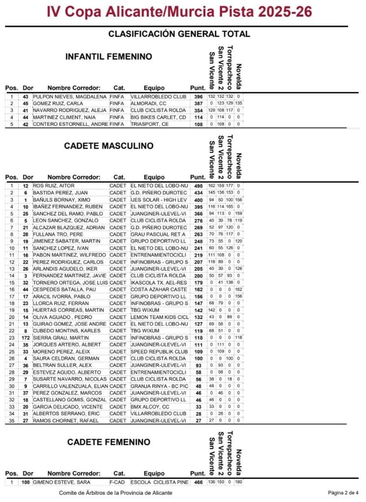 Calendario. IV Copa Alicante Murcia de Pista. GENERAL