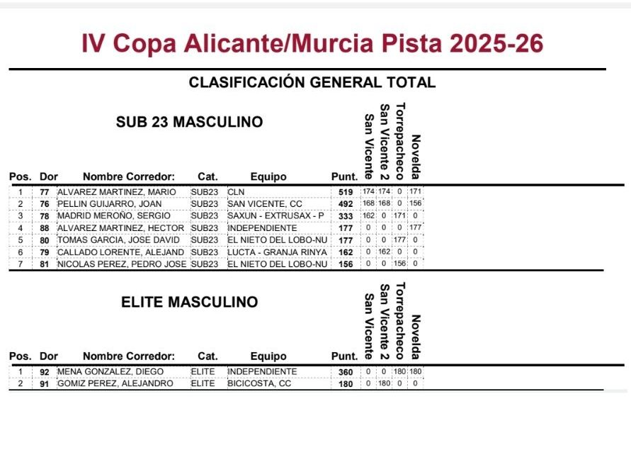 Novelda ha vivido hoy la jornada final de la Copa Alicante-Murcia de Pista. Bruno López (Sax) y Vera Fullana (Bernia-Xaló) se han llevado el triunfo en el Torneo en Alevines; Alejandro Mirete (Alcantarilla) y Magdalena Pulpón (Villarrobledo), en Infantiles; Aitor Ros (El Nieto del Lobo) y Sara Gimeno (PC Pinedo), en Cadetes; Alejandro Soto (El Nieto de Lobo) y Amanda Miravet (Ciclismo Base Femenino UPV), en Júniors; Mario Álvarez (CLN), en Sub 23; y Diego Mena, en Élite.