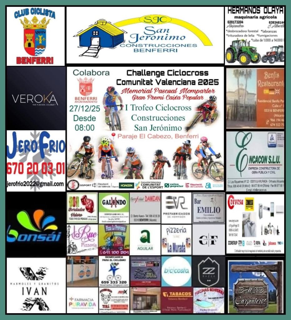 Benferri y Orihuela despiden este fin de semana la temporada de Ciclocross en la Comunidad Valenciana. Este sabado desde las 8:30 horas, organizado por el Club Ciclista Benferri, se disputa el I Trofeo Ciclocross Construcciones San Jeronimo en la localidad de la Vega Baja.