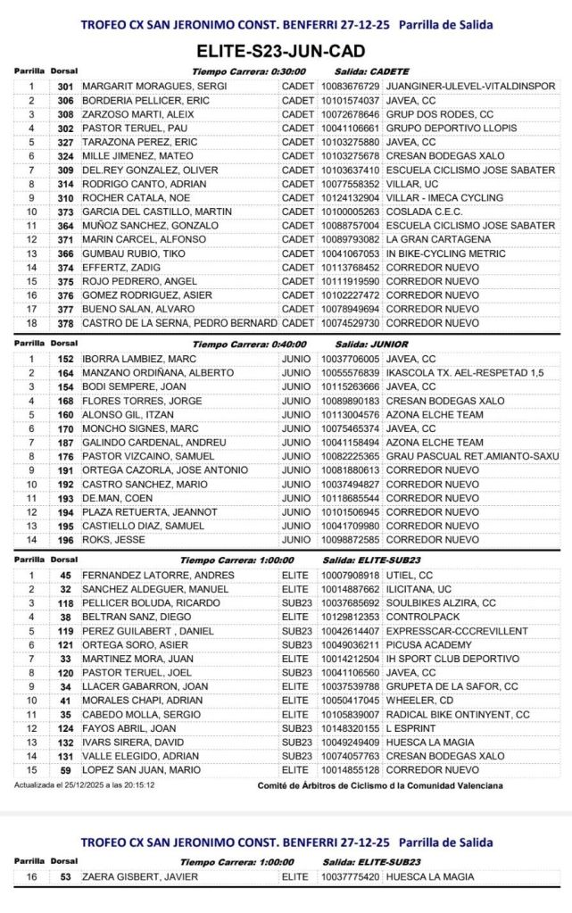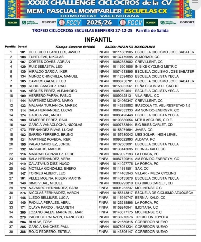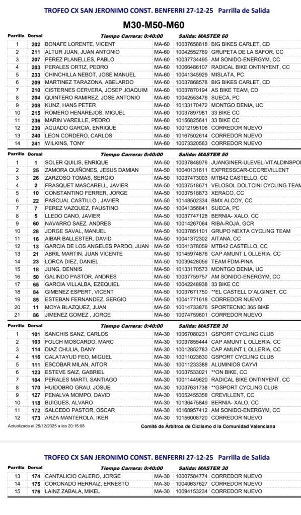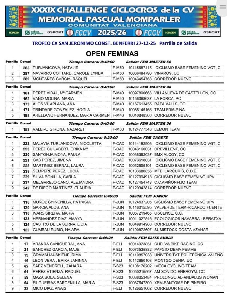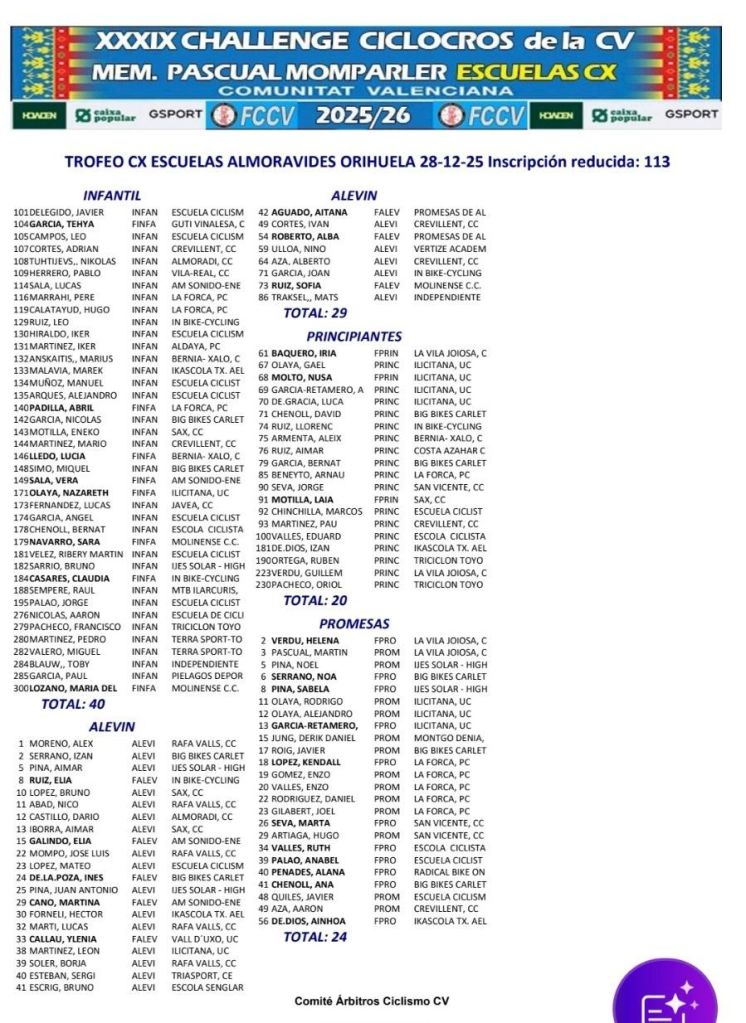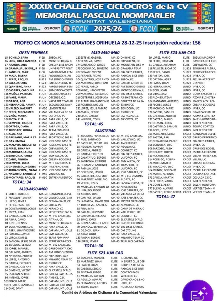 Al día siguiente, en Orihuela, se pone el punto y final a la Challenge CX de la CV – Memorial Pascual Momparler 2025. Será en I Trofeo CX Almoravides, que repartira los maillots definitivos de la temporada 2025.