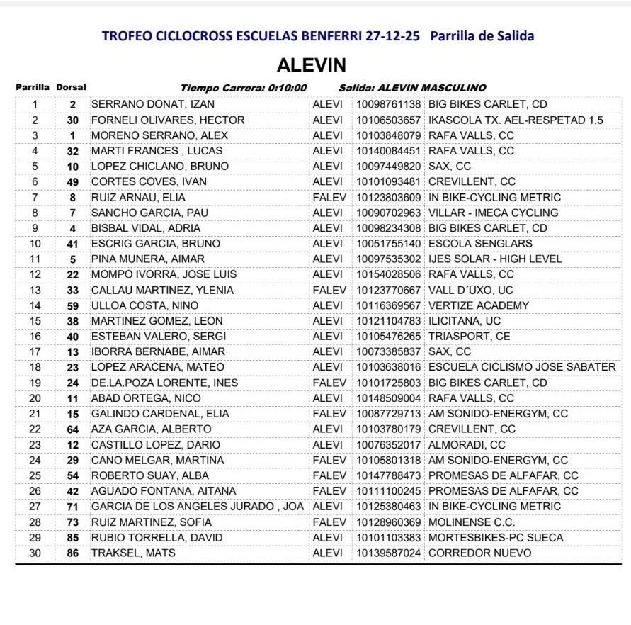 07/12. CX Rafa Valls. Cocentaina. Sólo puntuable para Escuelas. Clasificaciones