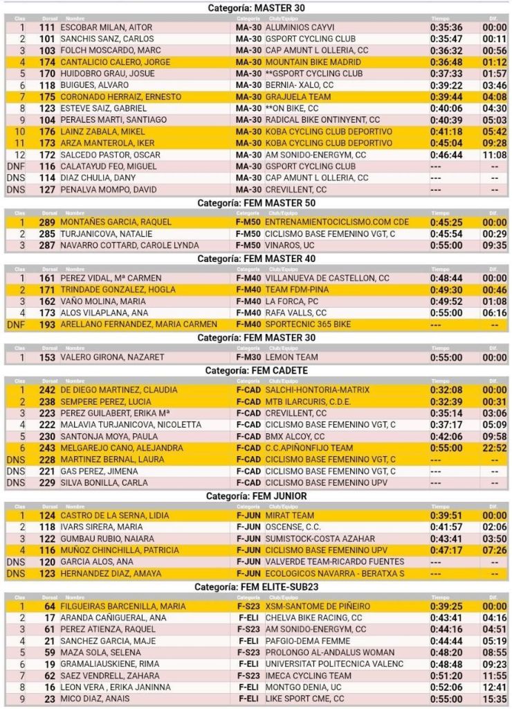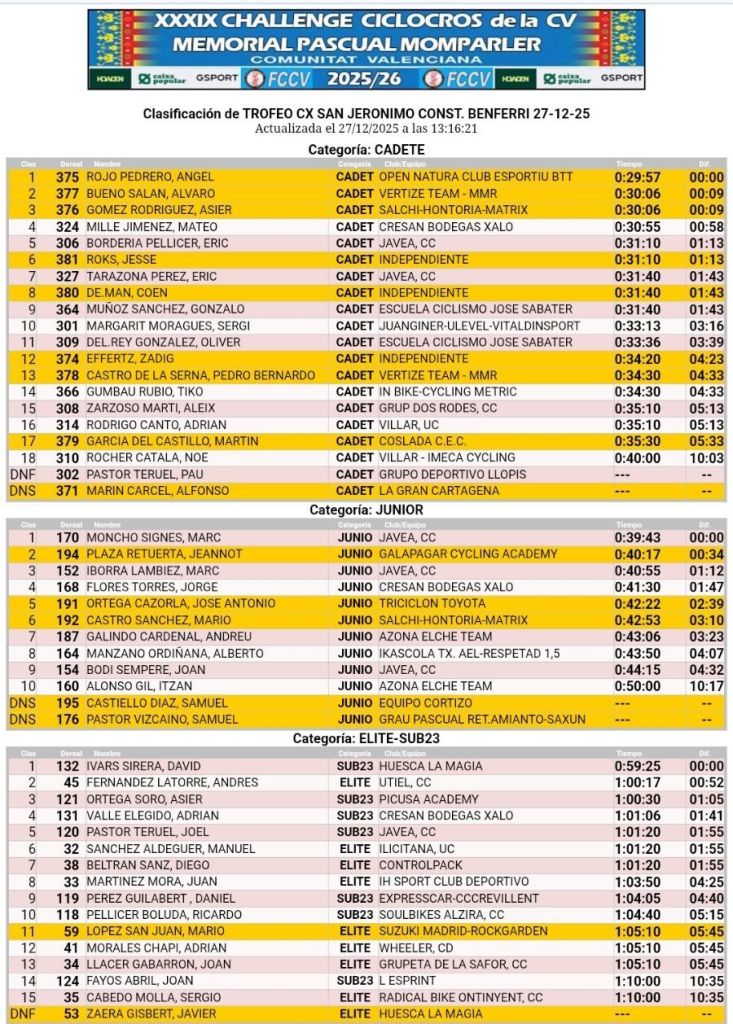 13/12 XXII CICLOCROSS CIUTAT DE CARLET – MEMORIAL JAVI BOU. Clasificaciones