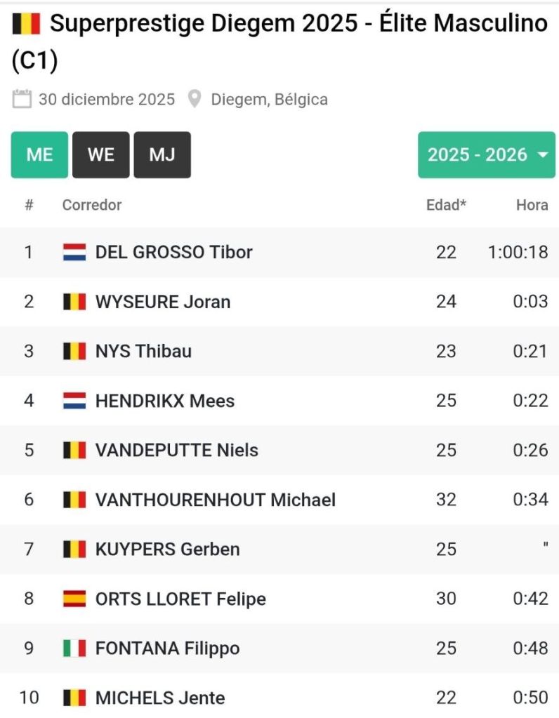 El ciclista neerlandés Tibor del Grosso ha ganado este lunes en El Superprestige de Diegem. Joran Wyseure y Thibau Nys han completado el podio. Octava plaza de Felipe Orts.