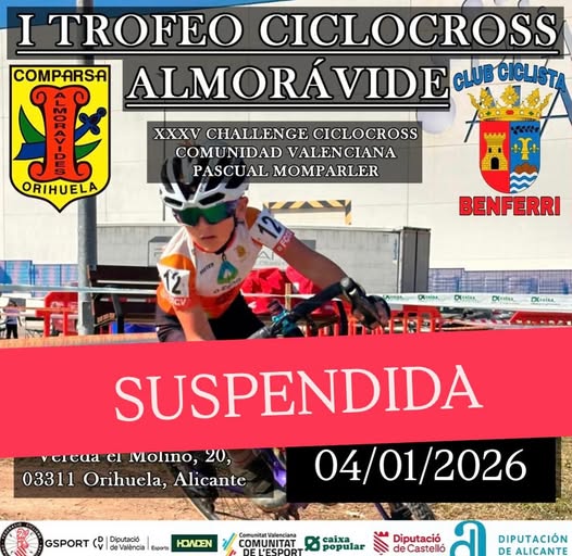 El Clu Cicista Benferri informa que elI Trofeo de CX Almorávides, que se iba a disputar el domingo 4 de enero en Orihuela, ha quedado suspendido. La carrera se aplazó anteriormente, el 28 de diciembre, por las condiciones meteorológicas adversas.
