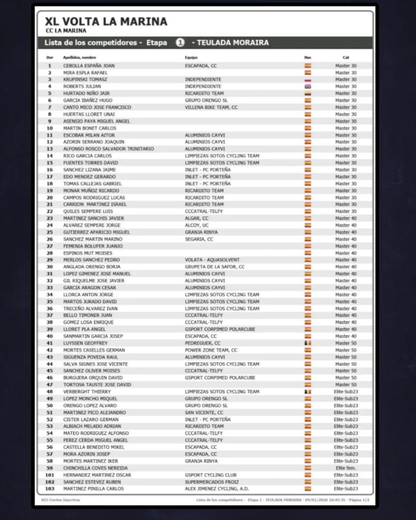 La XL edición de la Volta a la Marina comenzará el domingo, 11 de enero, en Teulada, con una etapa que finalizará en Moraira, en la que los ciclistas afrontarán un recorrido de 70 kilómetros. La etapa incluirá ascensiones al alto de la Llosa de Camacho (km 27) y Portet d’Orba (km 45,5). La carrera comenzará a las 11 de la mañana, con una llegada estimada alrededor de las 12:46, según el horario más rápido previsto por la organización. ¡Una jornada emocionante para los amantes del ciclismo!