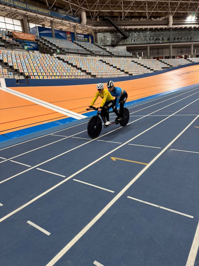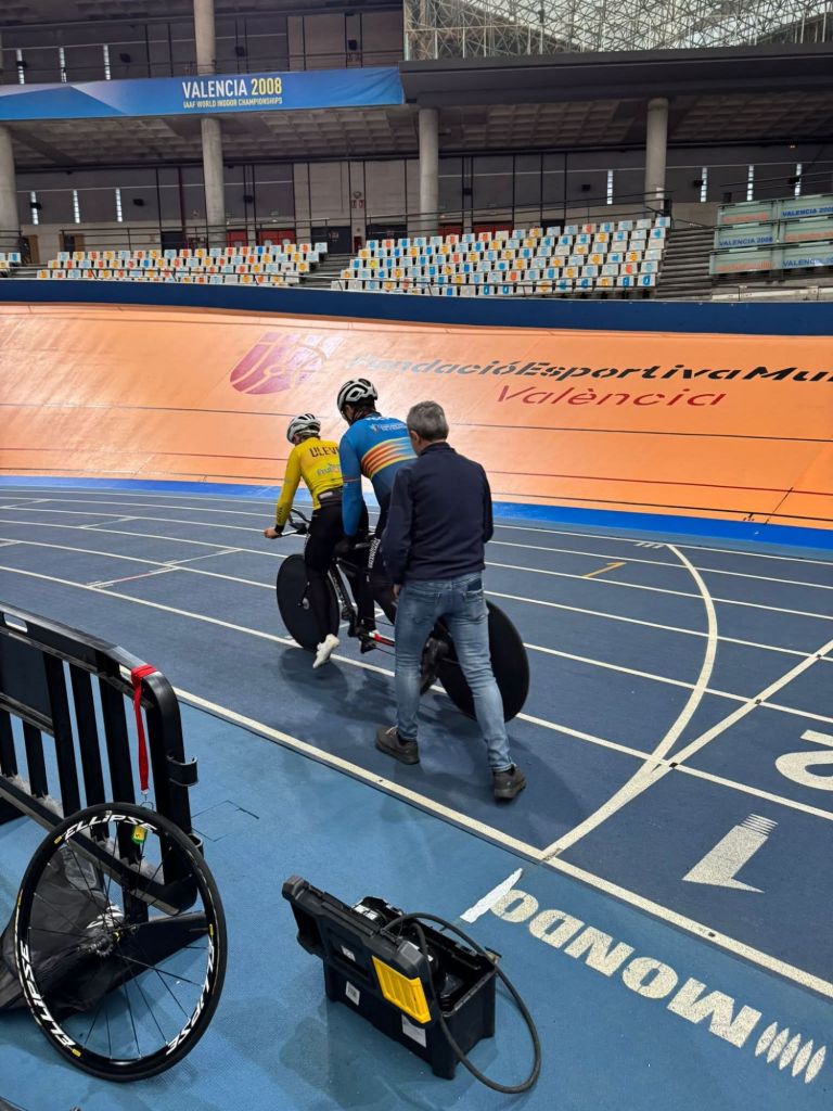 Los entrenamientos de la Selección de Paraciclismo de la Comunitat Valenciana siguen sumando horas el Velòdrom Lluis Puig de València. Ayer por la tarde trabajaron Jorge Negre y Rubén Capdevila. Javi Capella ejerció de mecánico. Practicaron el Kilómetro y los 200 metros. También estuvo de visita el presidente de la FCCV José Enrique Gutiérrez.