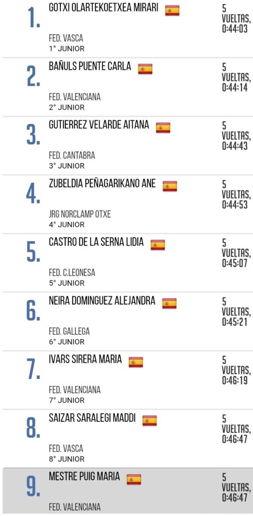 Mirari Gotxi es la nueva campeona de España júnior. Espectacular remontada de la ciclista vasca tras una tempranera caída. Segunda plaza y medalla de plata para Carla Bañuls. Aitana Gutiérrez (Cantabria) ha completado el podio. Top 9 de María Ivars, séptima, y de María Mestre, novena.