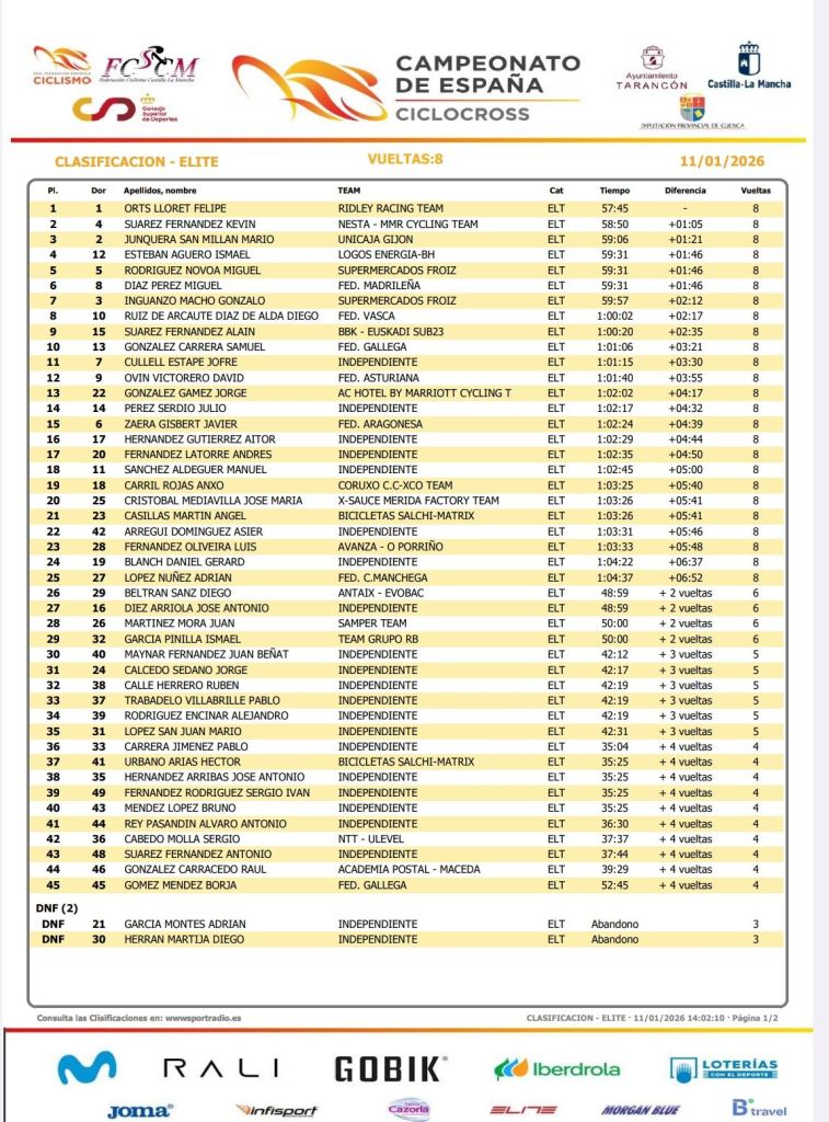 El Campeonato de España de Ciclocross 2026 ha llegado a su final hoy en Tarancón con una jornada para la historia en la que Felipe Orts se ha convertido en el ciclocrossista nacional con más títulos de campeón de España, superando a otra leyenda como Aida Nuño, con siete títulos en su haber. Sofía Rodríguez ha conquistado su segundo título nacional consecutivo, mientras que Lorena Patiño se ha adjudicado el triunfo sub23 y Benjamín Noval y Mirari Gotxi las victorias en categoría júnior, con Carla Bañuls, segunda en su primer año en la categoría.