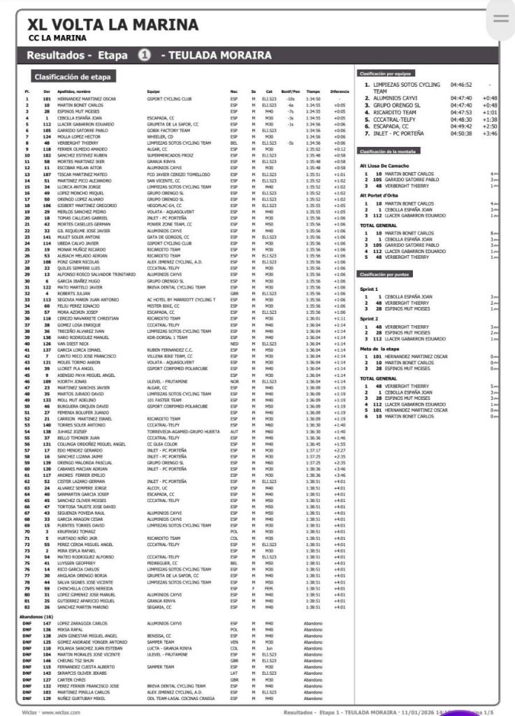 Etapa 1. 11 de enero de 2026: Teulada–Moraira. 11 horas. Trofeu Ajuntament de Teulada. 70Km. Clasificaciones