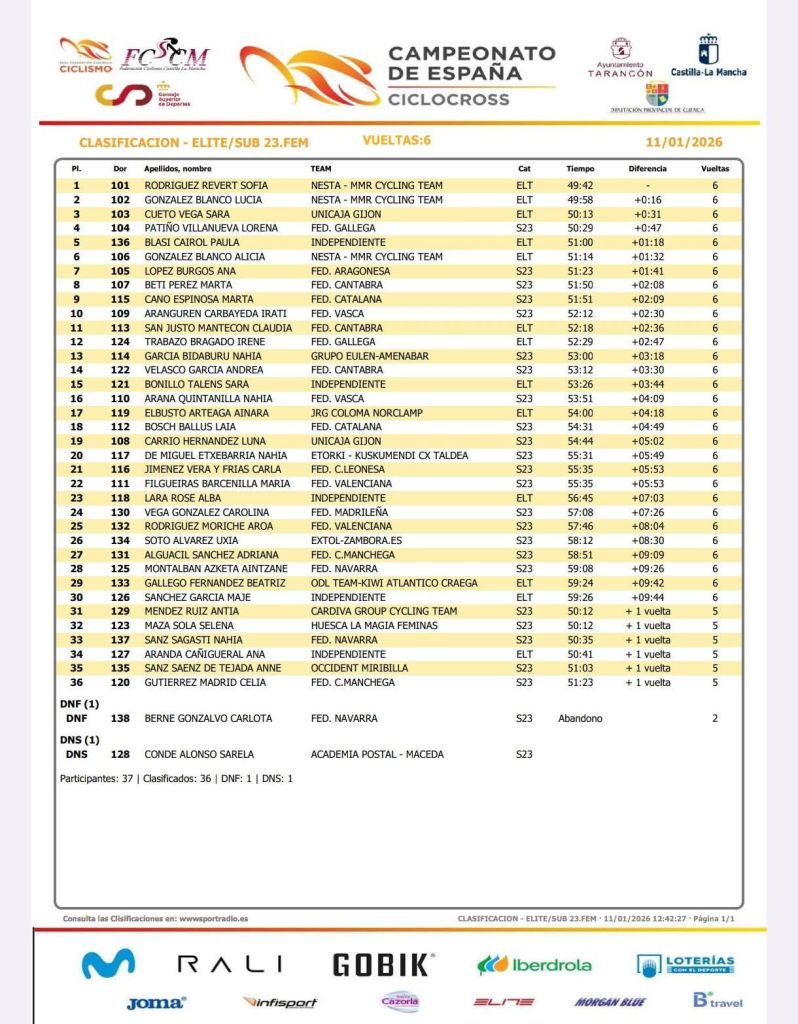Sofía Rodríguez ha revalidado esta mañana en Taracon su título de campeona de España de Ciclocross en la categoría Élite Femenina. La corredora valenciana del Nesta ha estado acompañada en el podio por su compañera de equipo Lucía González y por Sara Cueto.