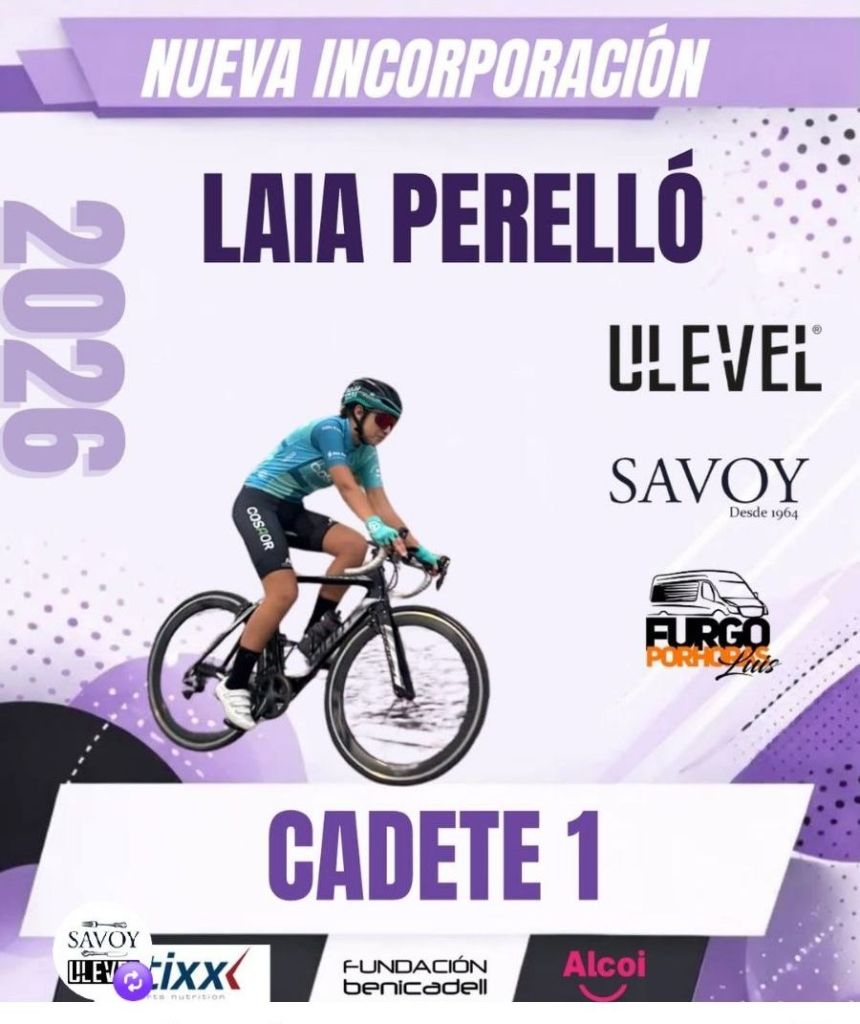 Laia Perelló (Vila-Real, 3 de marzo de 2011) vive en Onda. Debutará como Cadete en 2026 con el Hostal Savoy Ulevel WTeam. Desde los 6 años vive entre ruedas y su objetivo no es otro que seguir aprendiendo en la escuadra femenina de la Fundación Benicadell. «Invisible», de Eloy Moreno, es el último libro que ha leído.