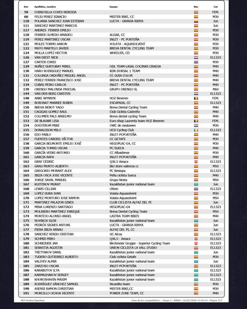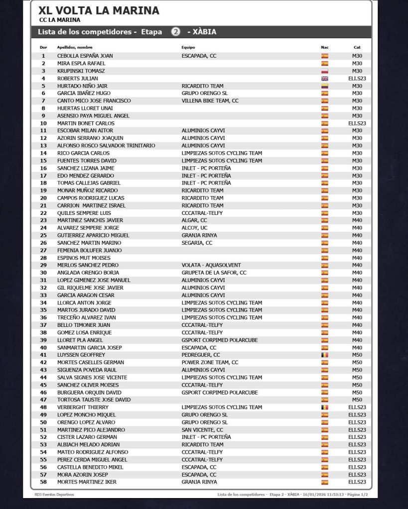 Etapa 2. 17 de enero de 2026. Xàbia (Jávea). 11h. XX Trofeo San Sebastián, con un recorrido de 67 km.