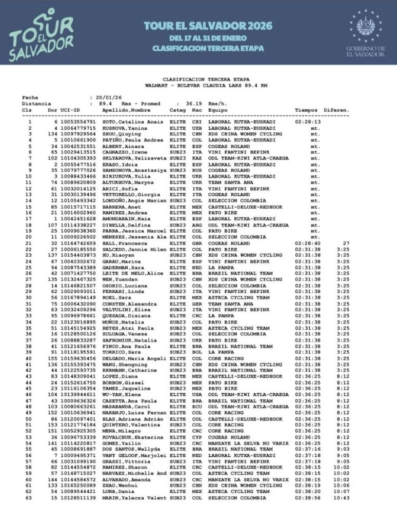 La ciclista Catalina Anaís Soto del @LABORALkTeam es la ganadora de la tercera etapa del tour, en una definición que fue deliberada por los jueces tras un cierre de carrera apretado.#TourElSalvador2026 pic.twitter.com/OY24cXFPhG