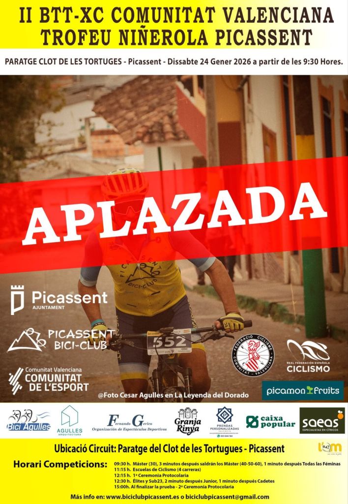El II BTT-XCO Comunitat Valenciana – Trofeu Niñerola Picassent que debía celebrarse el próximo sábado 24 de enero en Picassent, debido a la baja participación de corredores inscritos, desde la organización se ha decido APLAZAR la prueba a una fecha aun por determinar.