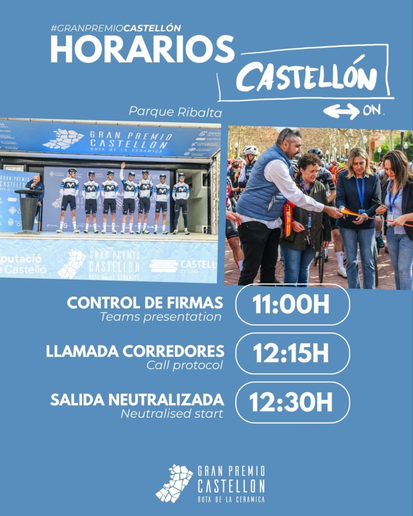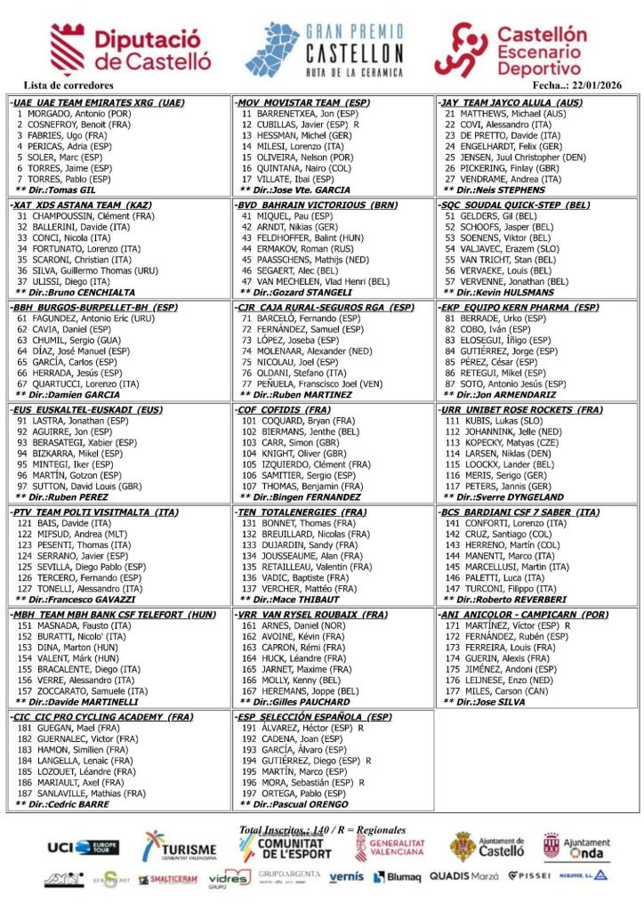 El Gran Premio Castellón-Ruta de la Cerámica se disputa hoy, sábado 24 de enero, a partir de las 12.30 horas. La prueba de un día, con 171,7 km entre Castellón y Onda, servirá tanto para que los ciclistas comprueben su estado de forma como para que los más fuertes puedan marcar la diferencia, gracias a un recorrido no extremadamente duro, pero sí selectivo, sobre todo en el tramo final.