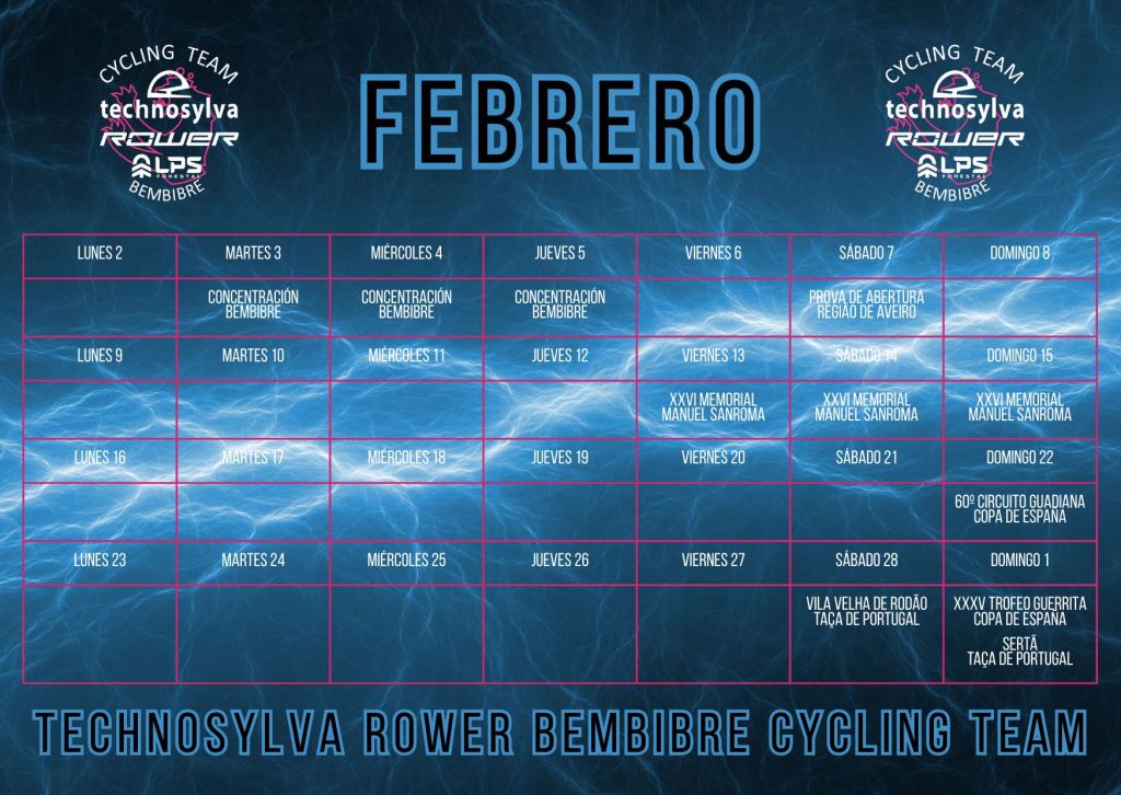 La actividad competitiva se intensificará a partir del domingo 22 de febrero, fecha en la que el Technosylva Rower Bembibre Cycling Team iniciará su participación en la Copa de España élite-sub23, como es tradición, en el Circuito del Guadiana. Apenas una semana después, el equipo volverá a Portugal para arrancar la Taça de Portugal, compitiendo en las pruebas de Vila Velha de Ródão y Sertã, mientras que ese mismo domingo disputará la segunda cita de la Copa de España, el XXXV Trofeo Guerrita.