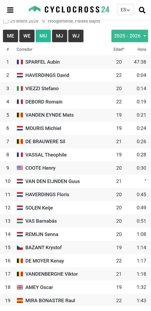 Raúl Mira completa en 19ª posición la carrera sub23 de la Copa del Mundo de Hoogerheide. El corredor alicantino de la Selección Española ha estado a un gra nivel en una prueba muy competida y con un elevado nivel.