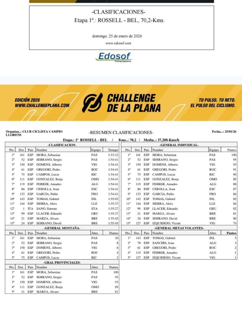 - Etapa 1. 25/01/2026 – Rossell-Bel. 10.30h. 70.2 km. Clasificaciones