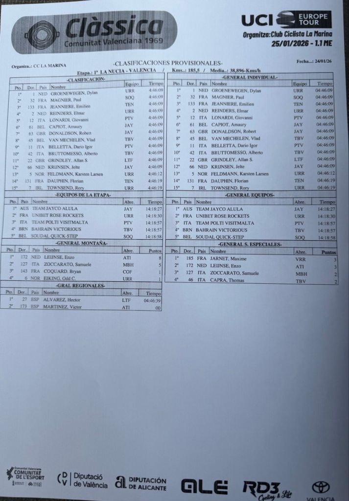 Pese a ello, los dos fugados han logrado puntuar tanto en Coll de Rates como en el Alto de Beniarrés siendo Enzo Leijnse el que más puntos ha sumado para llevarse la clasificación de la Montaña. El neerlandés también ha sido el primero en cruzar el Sprint Intermedio de Alfarrasí, aunque no le ha servido para la victoria de esta clasificación.