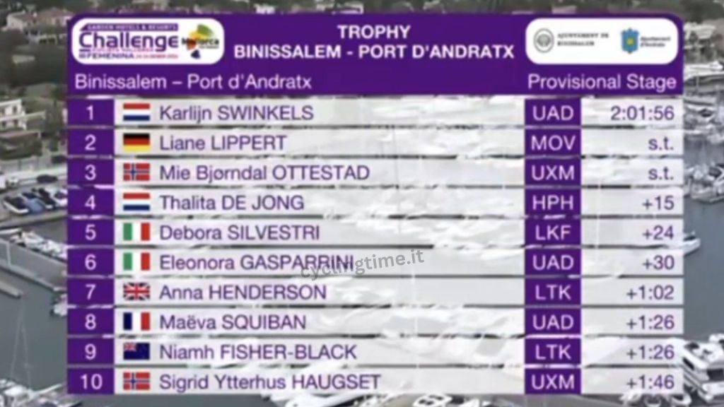 La jornada se decidió en los tres kilómetros finales de ascensión a Mon Port, donde un selecto grupo de ocho corredoras se jugó la victoria. Este grupo se había formado a 26 kilómetros de la meta, tras una intensa selección provocada por el alto ritmo impuesto desde el inicio de la prueba. En el momento clave, Swinkels demostró ser la más fuerte y logró así la segunda victoria para el UAE Team ADQ en esta edición de la Challenge, después del triunfo conseguido en Felanitx por la francesa Maeva Squiban.