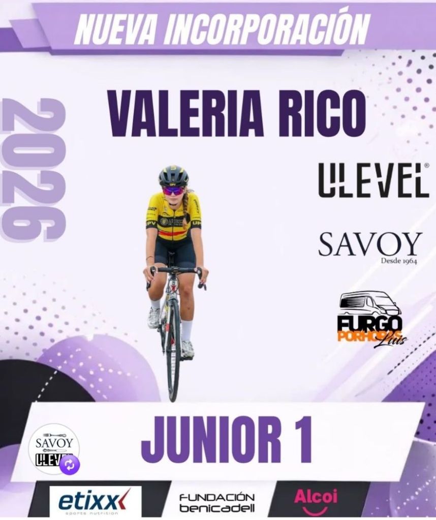Valeria Rico (Benidorm, 8 de mayo del 2009) debuta como júnior en el Hostal Savoy Ulevel WTeam tras su paso por el Ciclismo Base Femenino UPV. Es una entusiasta del ciclismo, respira este deporte por todos sus poros y su ídolo es Luis Gerardo Álvarez. Junto a Noa Jiménez se colgó el bronce, con el maillot de la Selección Valenciana de Pista en Madison, en el Campeonato de España celebrado a principios de enero en Mallorca. «Esta medalla significa muchísimo para mí porque es la recompensa a un objetivo que llevaba persiguiendo desde hace más de un año: conseguir ser deportista de élite. Estoy pasando por una lesión bastante fuerte, así que llegar hasta aquí ha sido gracias al esfuerzo e ilusión que tengo por el ciclismo#, apunta la benidormense antes de confesar que «orrer con Noa me fue de gran ayuda. Es una gran persona y corredora y no podría estar más agradecida con ella».
