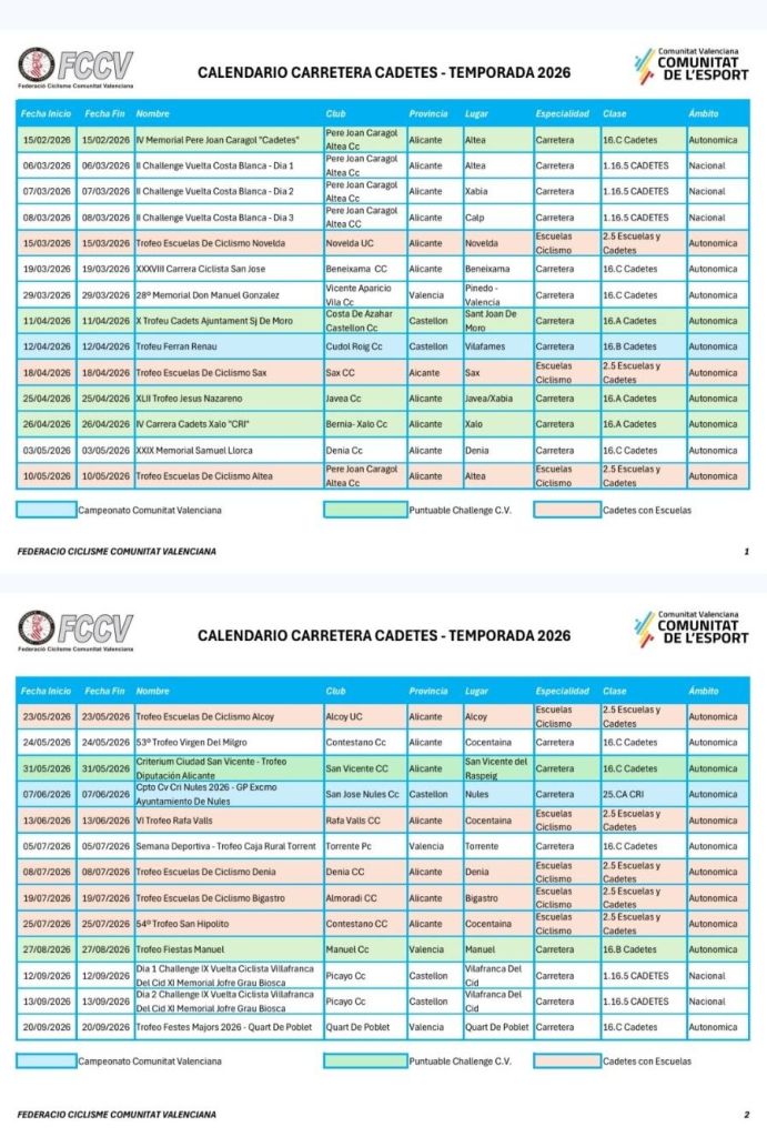 La Federació de Ciclisme de la Comunitat Valenciana agradece el trabajo de organizadores y clubes, pieza clave para hacer posible este calendario tan amplio, y desea a todos los cadetes una temporada llena de aprendizaje y experiencia.