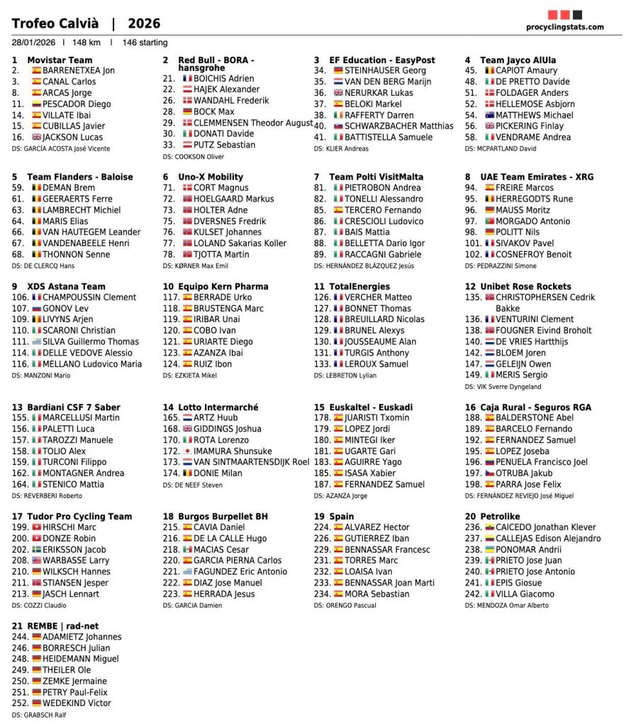 Acuden a la cita balear Manuel Peñalver (Polti VisitMalta), Javier Cubillas (Movistar), los corredores del Team Caja Rural-RGA Jaume Guardeño, Joan Bou y Francisco Peñuela, y los de la Selección Sub 23, de Pascual Orengo, Sebastián Mora, Héctor Álvarez, Ibán Gutiérrez e Iker Soriano. Hoy en Calvià se pondrán el dorsal Cubillas, Álvarez, Gutiérrez, Mora y Penuela.