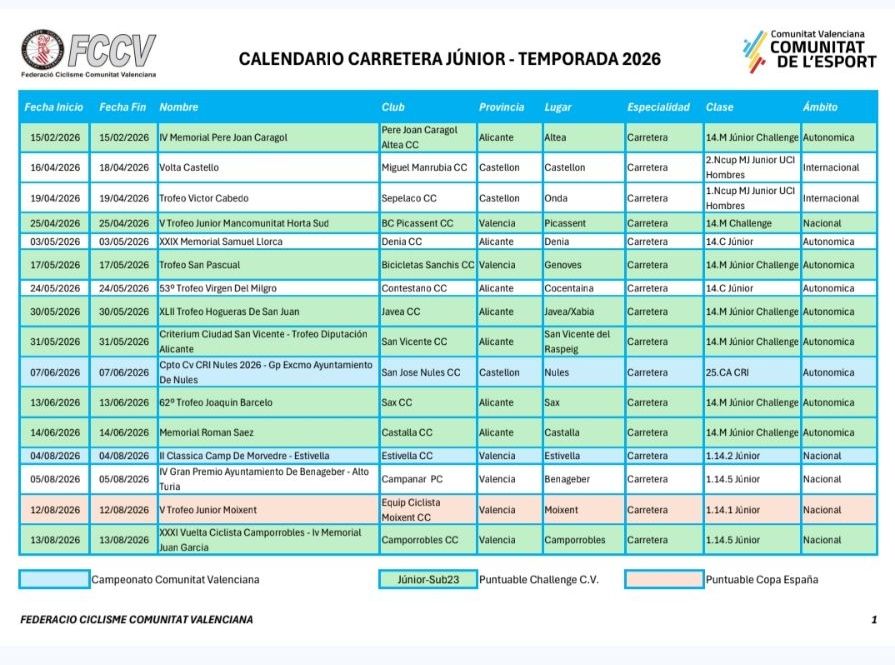 Como novedad para 2026, la Junta Directiva de la FCCV ha aprobado la creación de una nueva categoría autonómica de prueba 14.M, que permitirá la celebración de carreras conjuntas de las categorías Junior–Sub23, en las que ambas categorías puntuarán para la clasificación general de sus respectivas challenges. El objetivo es ampliar el calendario competitivo de los Sub23 y, al mismo tiempo, favorecer una mayor participación en determinadas pruebas del calendario junior.