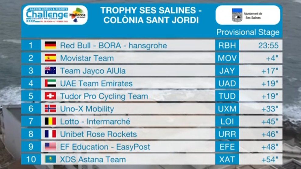 El Red Bull-BORA-hansgrohe que desde este 2026 capitanea Remco Evenepoel se ha impuesto este jueves en la novedosa contrarreloj por equipos de la Challenge Mallorca, el Trofeo Ses Salines (23,8 km) con final en la Colònia Sant Jordi. La formación de Ralph Denk sacó tres segundos a un impresionante Movistar Team, 2º, con Jayco AlUla, 3º a 16″, y UAE Team Emirates-XRG, 4º a 18″.