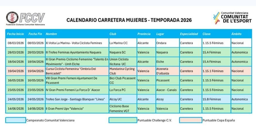 El calendario combinará pruebas de ámbito autonómico y nacional, incluyendo también, en su mayoría, citas puntuables para la Challenge Comunitat Valenciana y una jornada señalada para el Campeonato de la Comunitat Valenciana, conformando un bloque competitivo variado y continuo para el desarrollo del ciclismo femenino en carretera.