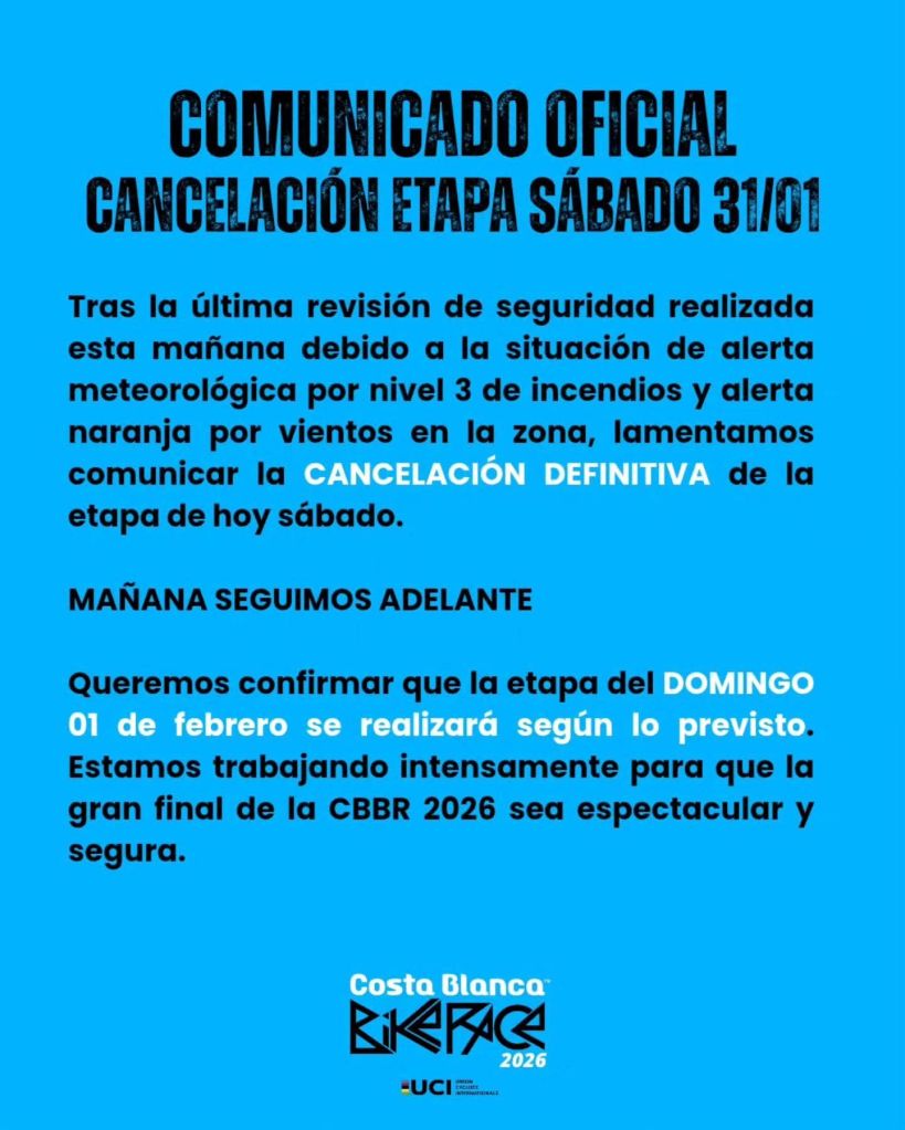 Tras la última revisión de seguridad realizada esta mañana debido a la situación de alerta meteorológica por nivel 3 de incendios y alerta naranja por vientos en la zona, «lamentamos comunicar la CANCELACIÓN DEFINITIVA de la etapa de hoy sábado. Queremos confirmar que la etapa del DOMINGO 01 de febrero se realizará según lo previsto. Estamos trabajando intensamente para que la gran final de la CBBR 2026 sea espectacular y segura».