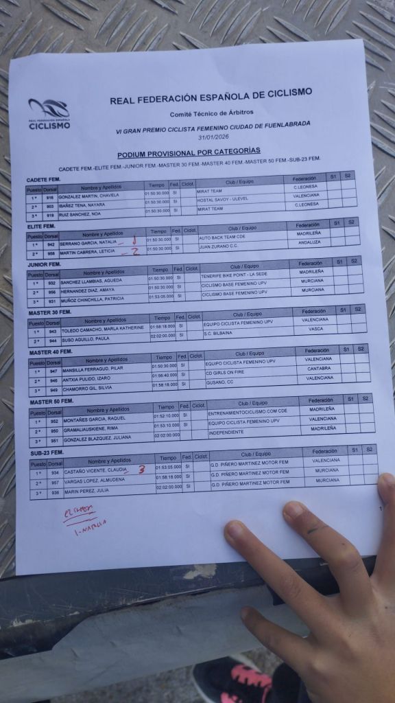 En la categoría Élite y Sub 23 Natalia Serrano (Auto Back Team) ha sido la primera, por delante Leticia Martín (Juan Zurano) y de Claudia Castaño (GD Pinero), tercera y primera Sub 23.