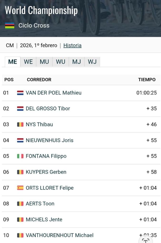 Séptima posición de Felipe Orts en el Mundial de Ciclocross de Hulst. Fantástica carrera del alicantino, que ha llegado a rodar en 4ª plaza en solitario y nos ha hecho soñar con el podio. Orts consigue así su mejor resultado mundialista de siempre. Mathieu van der Poel ha logrado el título por delante de Tibor del Grosso y de Thibau Nys.