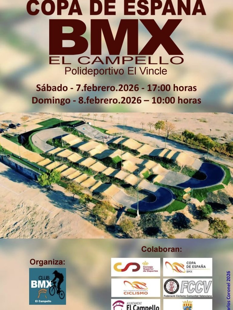 Este fin de semana, los días 7 y 8 de febrero, el Polideportivo Municipal «El Vincle» se convierte en el escenario de la Copa de España de BMX 2026. Los mejores riders del país se dan cita para demostrar su destreza, velocidad y adrenalina en una competición de alto nivel. La localidad alicantina será la encargada de abrir el calendario del citado Torneo esta temporada, en una prueba organizada por el Club BMX El Campello y que promete emociones fuertes desde la primera manga.
