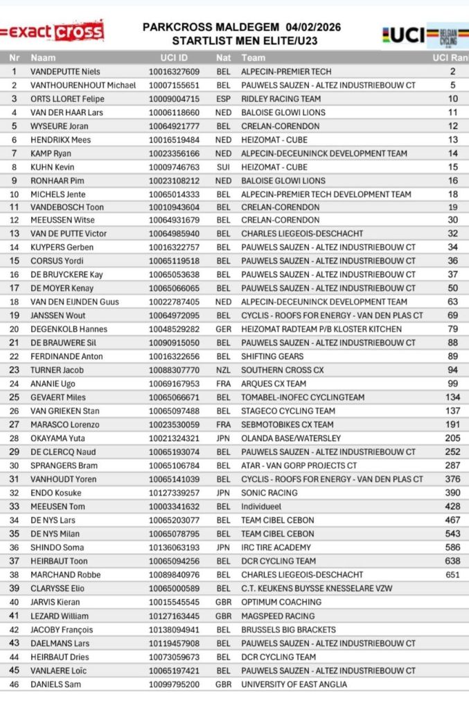 Hoy se disputa en territorio belga el Parkcross de Maldegem, prueba puntuable para la Exact Cross. Será la segunda edición de la serie en 2026 y la sexta prueba de la temporada. Tradicionalmente, es la primera carrera de ciclocross del calendario tras el Campeonato Mundial y así sucede en esta ocasión. Felipe Orts regresa a la competición tras su séptima plaza en el Mundial de Hulst, en el que terminó séptimo, con el deseo de aprovechar su gran momento de forma y de pisar el podio.