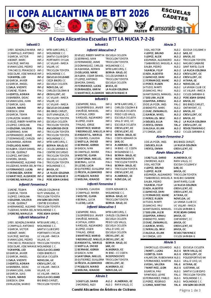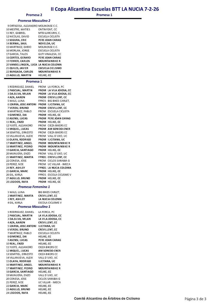 La Nucía Kids ha dado el banderazo de salida II Copa Alicantina de BTT Escuelas.Raúl Sempere (MTB Ilarcuris) y Claudia Casares (Costa Azahar) se han impuesto en Infantiles 1; Gonzalo María Rey (MTB Ilarcuris) y Telma Saenz (Crevillent), en Infantiles 2; Eduardo Morcillo (Yecla) y Valeria Vidal (Aitana), en Alevines 1; Darío Castillo (Almoradí) e Inés de la Poza (Big Bikes), en Alevines 2; Pablo Gil (Víctor Cabedo) y Cristina Iñesta (Crevillent), en Principiantes 1; Rubén Ortega (Triciclón) e Iria Baquero (La Vila), en Principiantes 2; Daniel Rodríguez (La Forca) y Luna Wals (Big Bikes), en Promesas 1; y Gabriel Marín (Cieza) y Kendal López (La Forca), en Promesas 2.