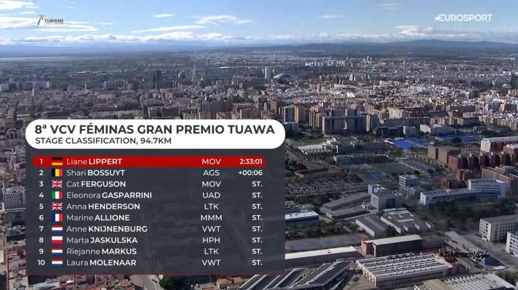 Liane Lippert (Movistar) se ha impuesto en solitario en la octava edición de la Volta a la Comunitat Valenciana Féminas, una carrera entre Bétera y Valencia de 94,7 kilómetros, con un tiempo de 2h.33.01, con seis segundos de ventaja sobre el grupo perseguidor, tras un gran trabajo del equipo navarro.