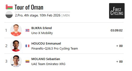 La cuarta jornada del Tour de Omán, con un recorrido de 181,5 kilómetros entre el Museo Across Ages y el Centro de Convenciones de Mascate, ha coronado a Erlend Blikra como el hombre más rápido del día. En una jornada para esprinters, el ciclista del Uno-X-Mobility superó a Emmanuel Houcou y Sebastián Molano. Iván García Cortina ha sido noveno.