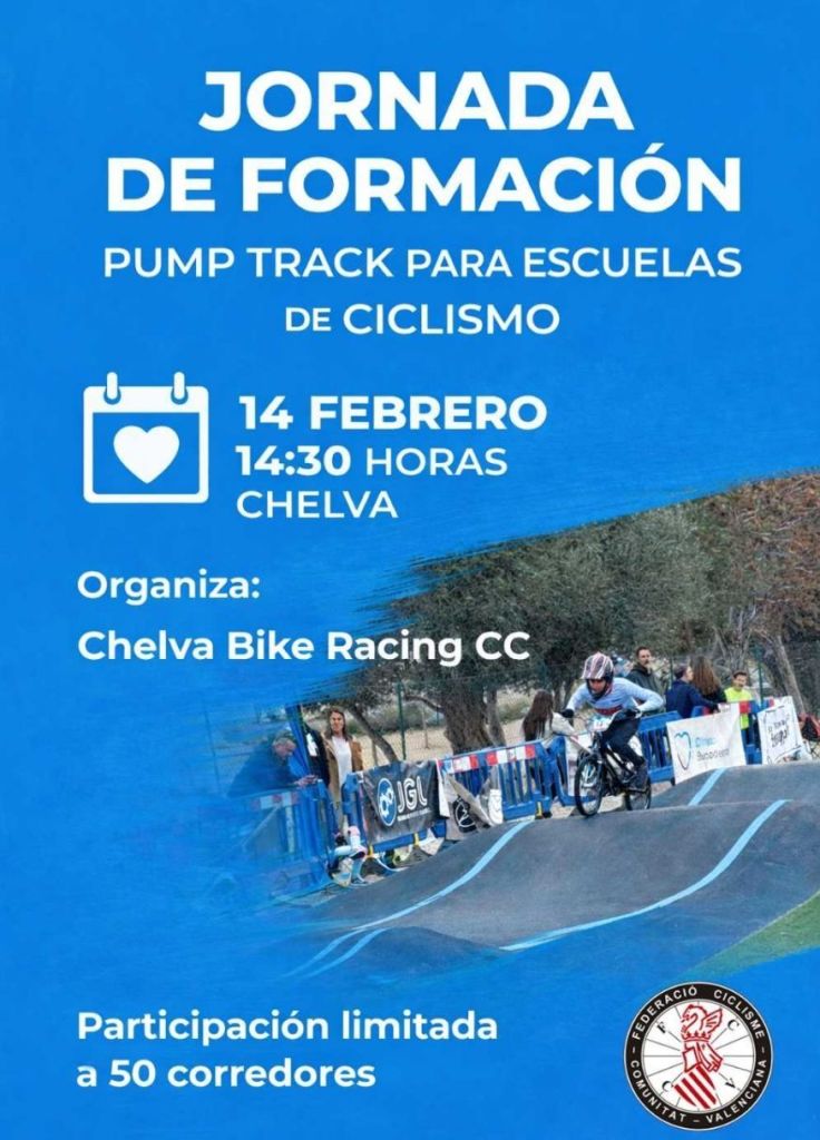 La Federació de Ciclisme de la Comunitat Valenciana informa que este próximo sábado 14 de febrero, habrá una jornada lúdica y formativa de BTT – pumptrack “Chelva-Pumptrack” en Chelva, en el contexto de los Internacionales Chelva. La actividad estará organizada por Chelva Bike Racing CC.