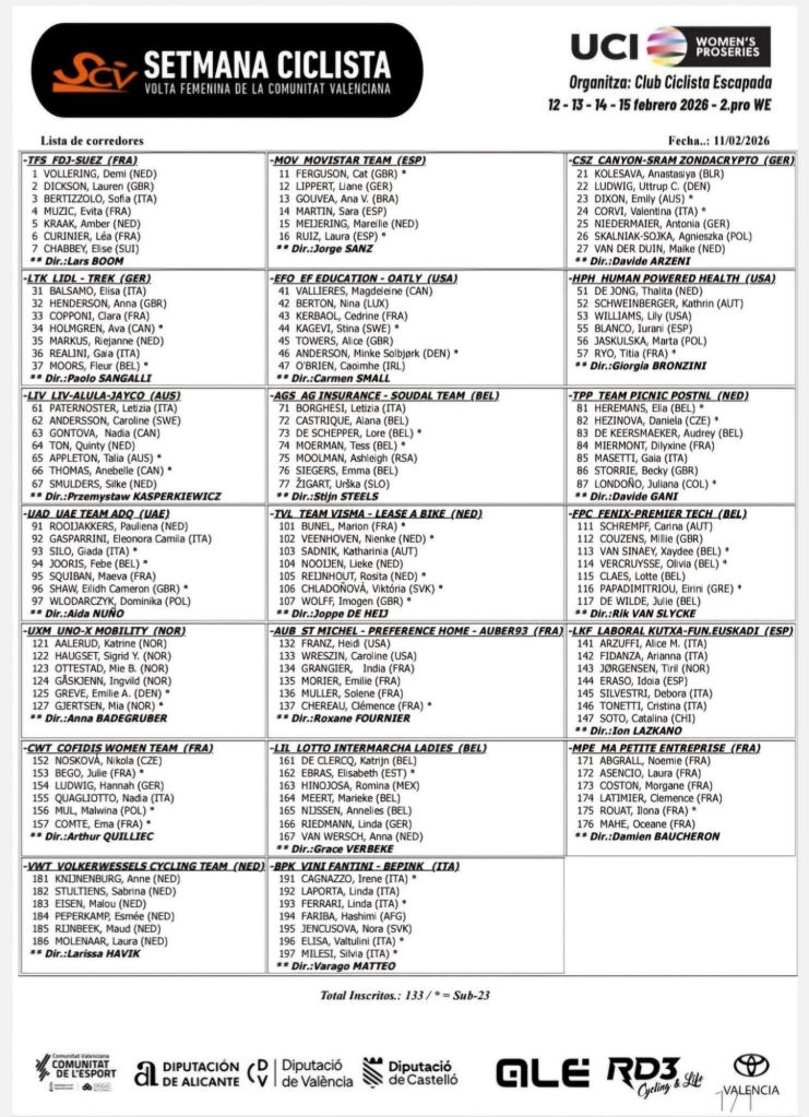 La 10ª edición de la Setmana Ciclista – Volta Femenina de la Comunitat Valenciana se celebra del 12 al 15 de febrero con las mejores ciclistas del mundo como protagonistas. Serán 4 días de ciclismo del máximo nivel alrededor de las tres provincias de la Comunitat Valenciana. 481,5 kilómetros repartidos en 4 etapas que ofrecerán oportunidades para ciclistas de diferente especialidad. Sprints, oportunidades para las cazaetapas y dos jornadas montañosas que dejan una carrera muy abierta en la que la fortaleza individual se une con la colectiva y la capacidad estratégica de los equipos.