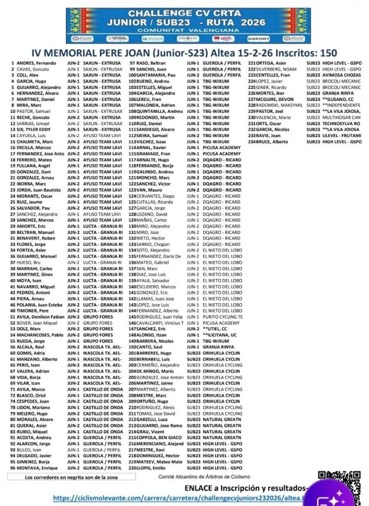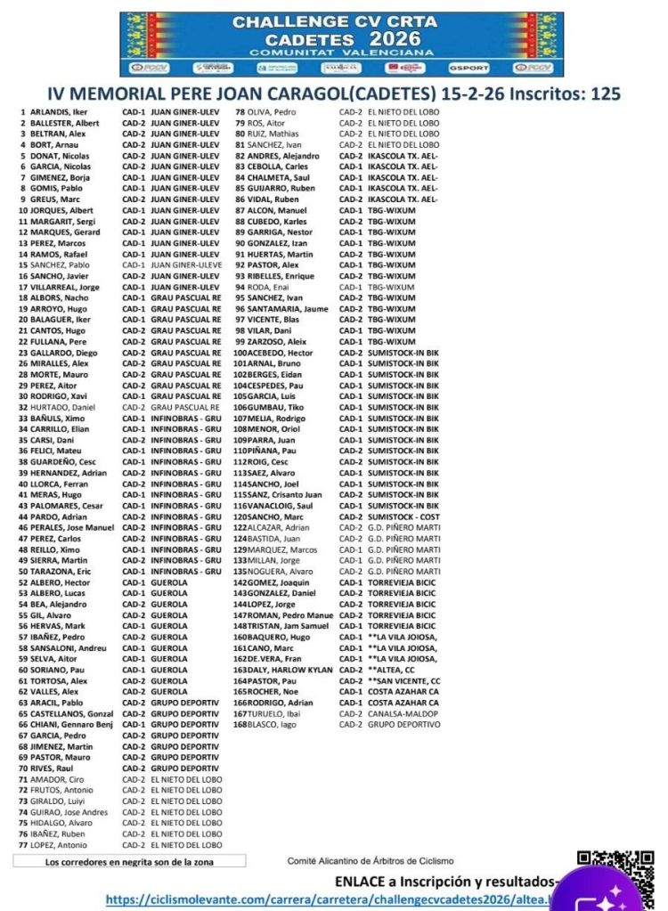 El domingo, día 15 de febrero, comienza en Altea la temporada de carreras ciclistas en ruta, categorías Cadete y Júnior, en la Comunidad Valenciana. El IV Memorial Pere Joan Caragol reunirá a 125 corredores en categoría Cadete y 150 Júnior o Sub-23.