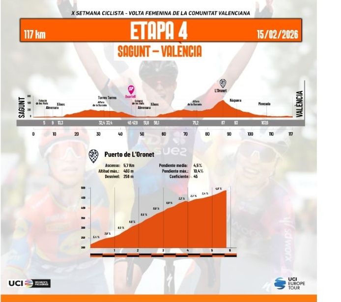 La cuarta y última etapa de la 10ª edición de la Setmana Ciclista: Volta Femenina de la Comunitat Valenciana unirá Sagunt con València en una bonita etapa de media montaña con 117 kilómetros de recorrido y el puerto de L’Oronet como punto clave.