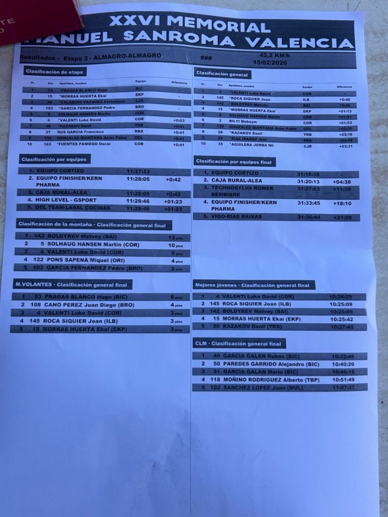 Hugo Pradas (El Bicho – Plataforma Central Iberum) se ha impuesto en Almagro en la tercera y última etapa del Memorial Sanroma. Ekai Morrás (Finisher) ha terminado segundo y Estanislao Calabuig (Filial Caja Rural) finalizó tercero. Luke David Valenti (Cortizo), con Joan Roca (Illes Balears – Arabay) y Boldyrev (PC Baix Ebre), a continuación.