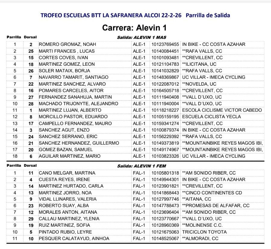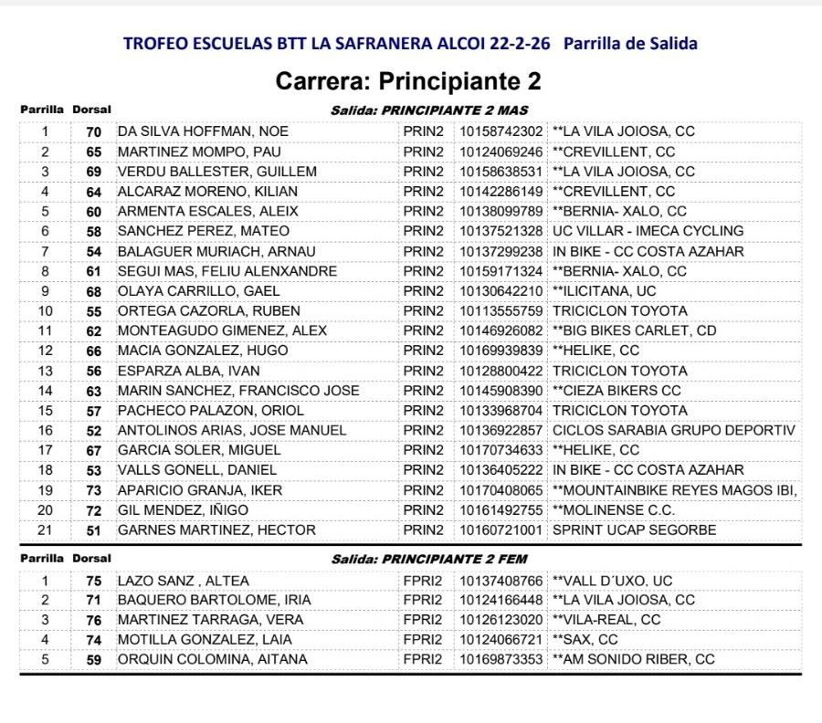La jornada deportiva empezará a las 9.00 horas con la salida de la categoría femenina. Posteriormente, sobre las 10.30 horas, será el turno de las categorías elite y sub-23, donde destaca la participación del ciclista alcoyano Pablo Garrido, quien correrá como principal representante local y una de las grandes promesas de la competición. La mañana se cerrará a las 13:00 horas con las pruebas dedicadas a las escuelas de ciclismo, que contarán con una participación masiva superior a los 200 jóvenes deportistas, sumando cerca de 300 corredores y corredoras a lo largo de la mañana.